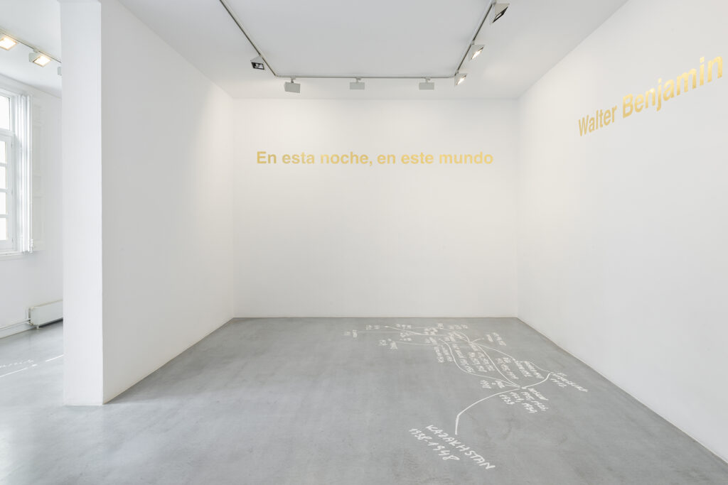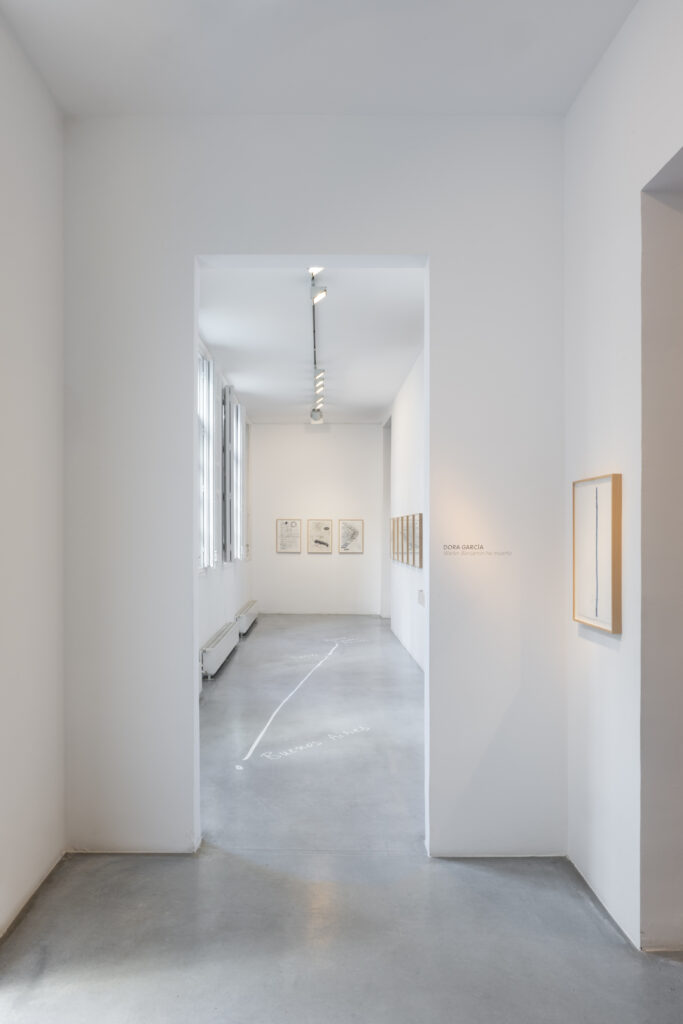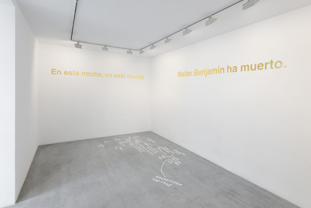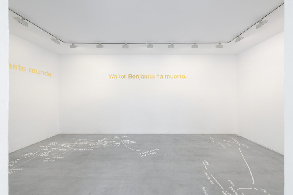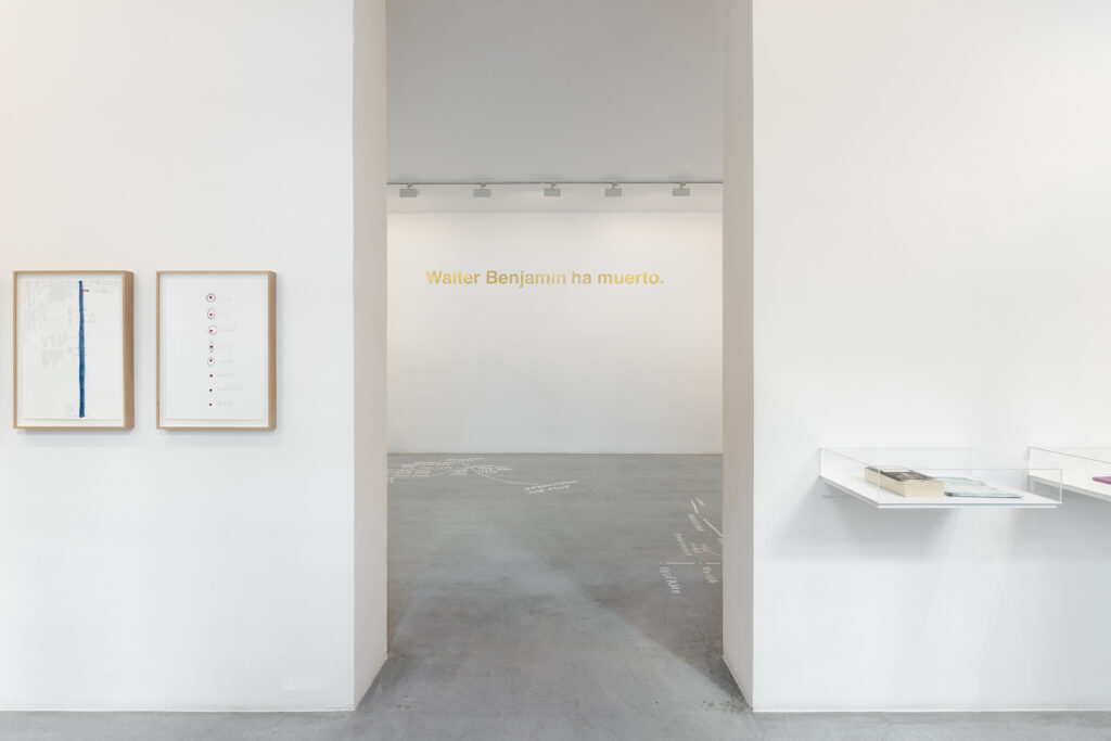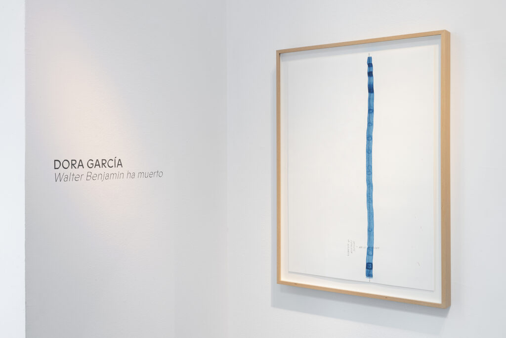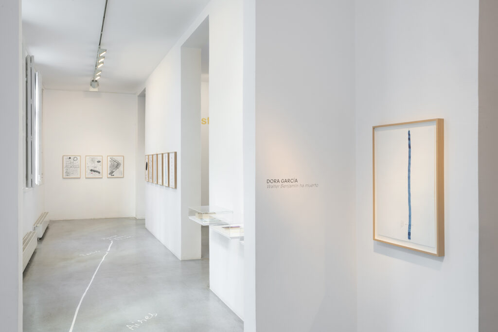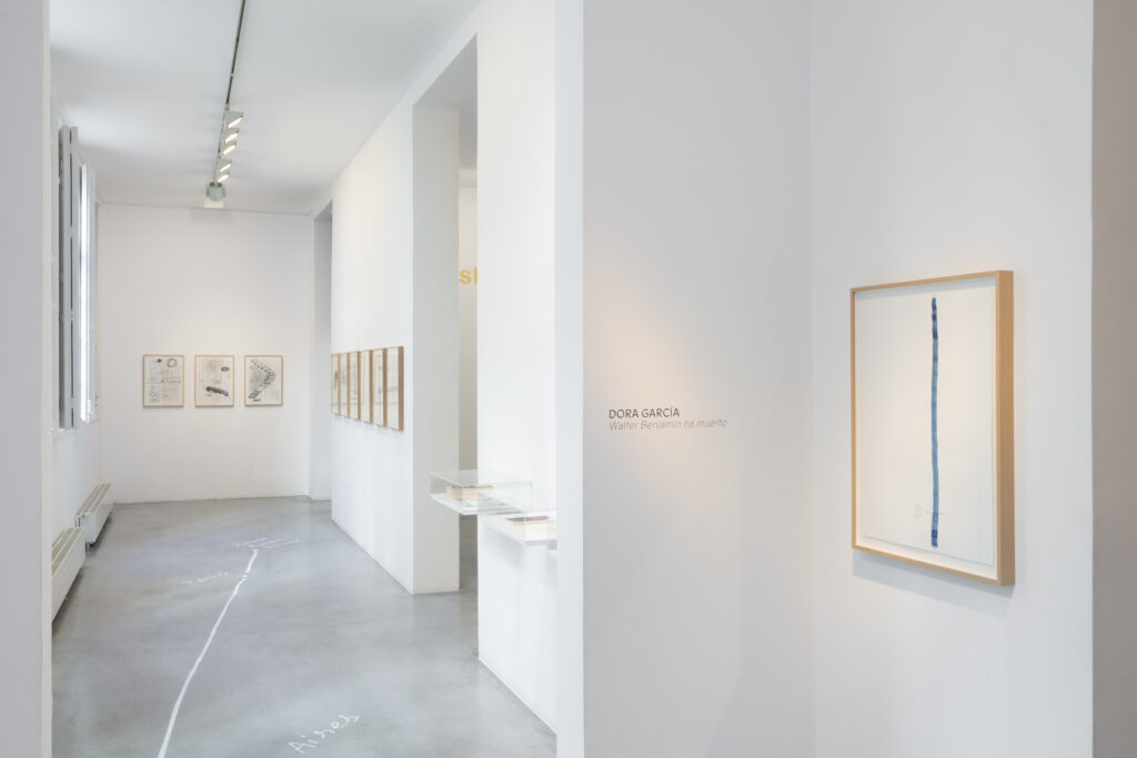 Walter Benjamin ha muerto, la actual exposición de Dora García en la Galería Elba Benítez, podría considerarse en su conjunto como una manifestación de este particular y peculiar tiempo verbal. La exposición toma como punto de partida la «lectura» que García hace de las vidas y las palabras de un pequeño grupo de figuras intelectuales y culturales radicales del siglo XX: Asja Lācis, directora de teatro y pedagoga letona; Carla Lonzi, crítica de arte y feminista italiana; Alejandra Pizarnik, poeta argentina; y (de forma algo más indirecta, pero aún así central) el teórico y crítico alemán Walter Benjamin. A partir de estas figuras del pasado, y en consonancia con su propia práctica artística distintiva, García ha creado una serie de obras interrelacionadas en diversos formatos basados en texto y dibujo, incluyendo dibujos en paredes y suelos, dibujos sobre papel y objetos de técnica mixta. Pero, aunque se basa en la historia intelectual, la práctica de García no deviene en una biografía intelectual; en cambio, al crear las obras de arte que se exponen en Walter Benjamin ha muerto, la propia «lectura» (y escritura) de García de las lecturas y los escritos de estas figuras históricas se ha convertido en parte de la historia, una historia que se extiende (y no puede dejar de extenderse) para incluir a la propia García y al presente en el que ella (junto con nosotros) habita. Como siempre, un retrato revela tanto sobre el retratista como sobre el retratado