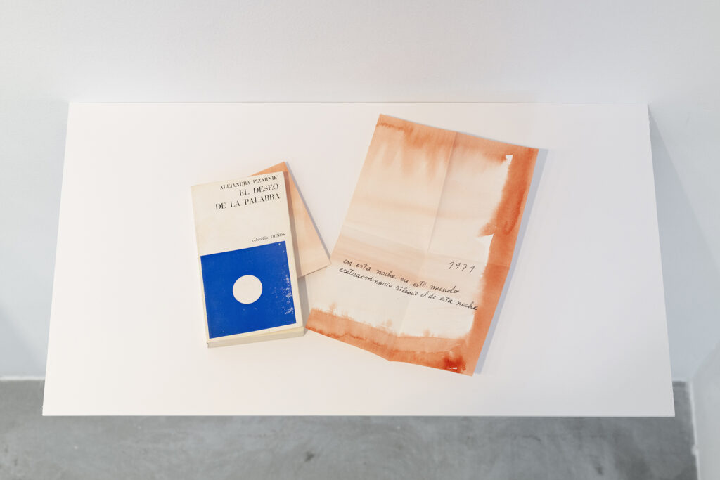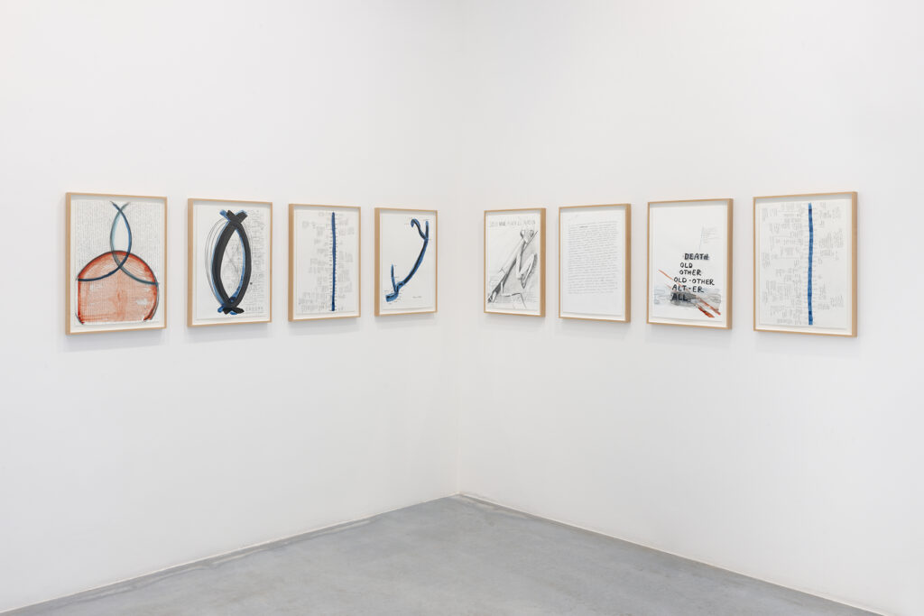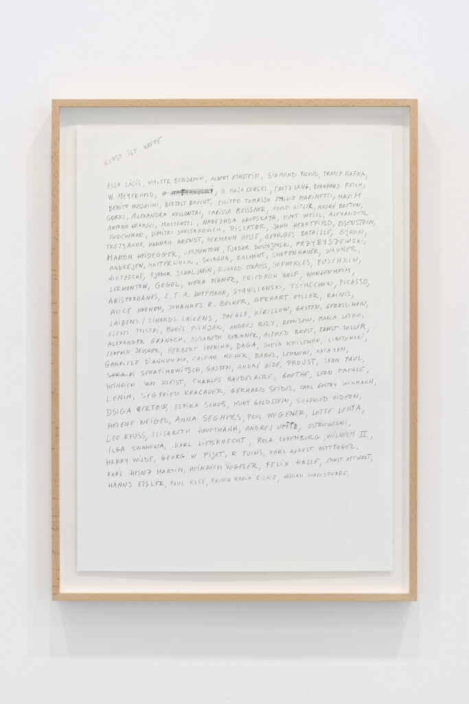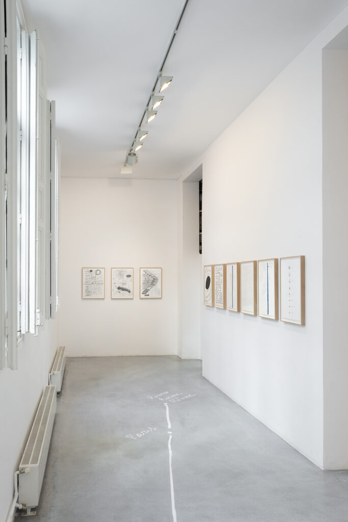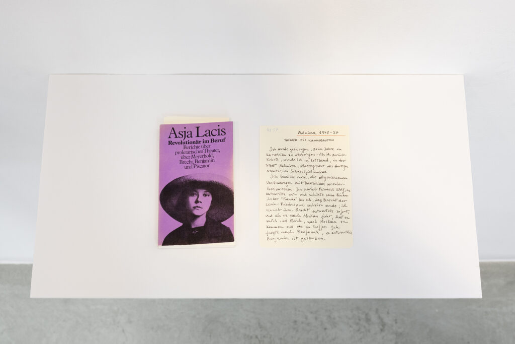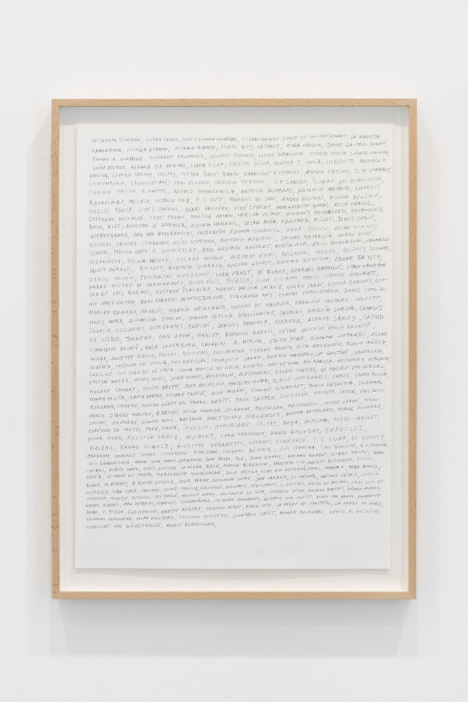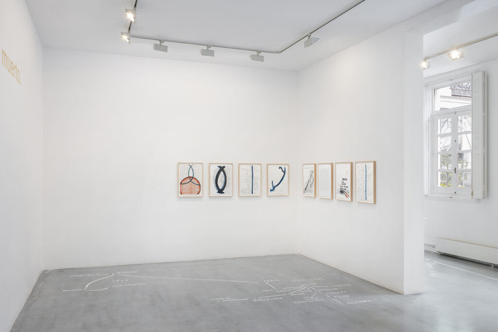 Walter Benjamin ha muerto, la actual exposición de Dora García en la Galería Elba Benítez, podría considerarse en su conjunto como una manifestación de este particular y peculiar tiempo verbal. La exposición toma como punto de partida la «lectura» que García hace de las vidas y las palabras de un pequeño grupo de figuras intelectuales y culturales radicales del siglo XX: Asja Lācis, directora de teatro y pedagoga letona; Carla Lonzi, crítica de arte y feminista italiana; Alejandra Pizarnik, poeta argentina; y (de forma algo más indirecta, pero aún así central) el teórico y crítico alemán Walter Benjamin. A partir de estas figuras del pasado, y en consonancia con su propia práctica artística distintiva, García ha creado una serie de obras interrelacionadas en diversos formatos basados en texto y dibujo, incluyendo dibujos en paredes y suelos, dibujos sobre papel y objetos de técnica mixta. Pero, aunque se basa en la historia intelectual, la práctica de García no deviene en una biografía intelectual; en cambio, al crear las obras de arte que se exponen en Walter Benjamin ha muerto, la propia «lectura» (y escritura) de García de las lecturas y los escritos de estas figuras históricas se ha convertido en parte de la historia, una historia que se extiende (y no puede dejar de extenderse) para incluir a la propia García y al presente en el que ella (junto con nosotros) habita. Como siempre, un retrato revela tanto sobre el retratista como sobre el retratado