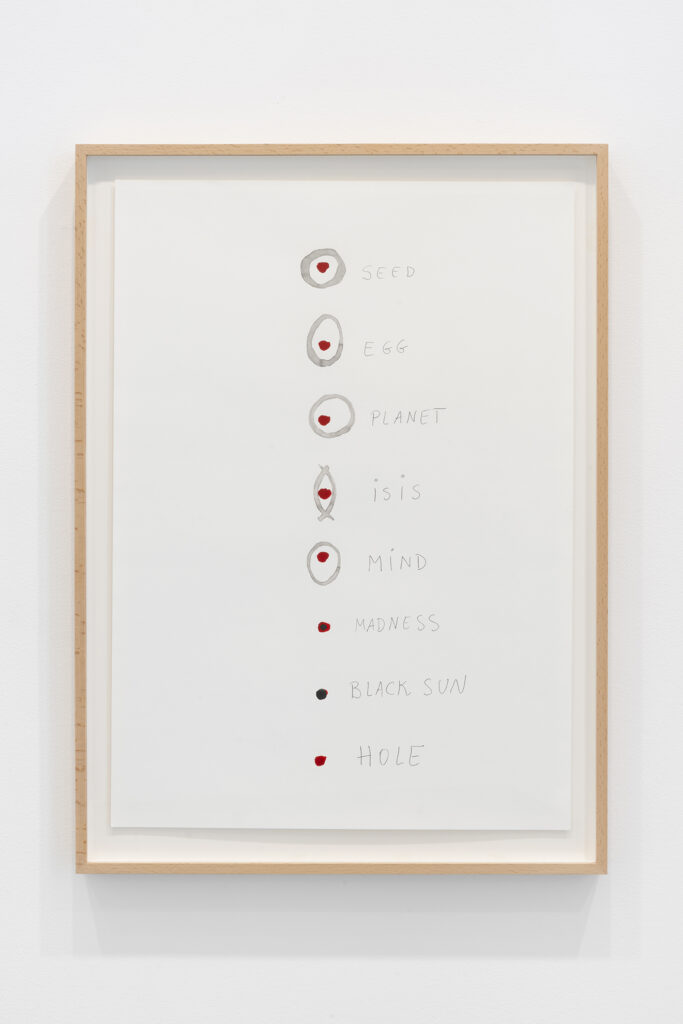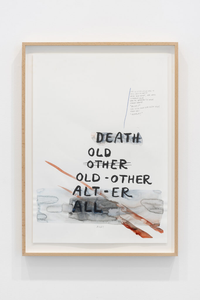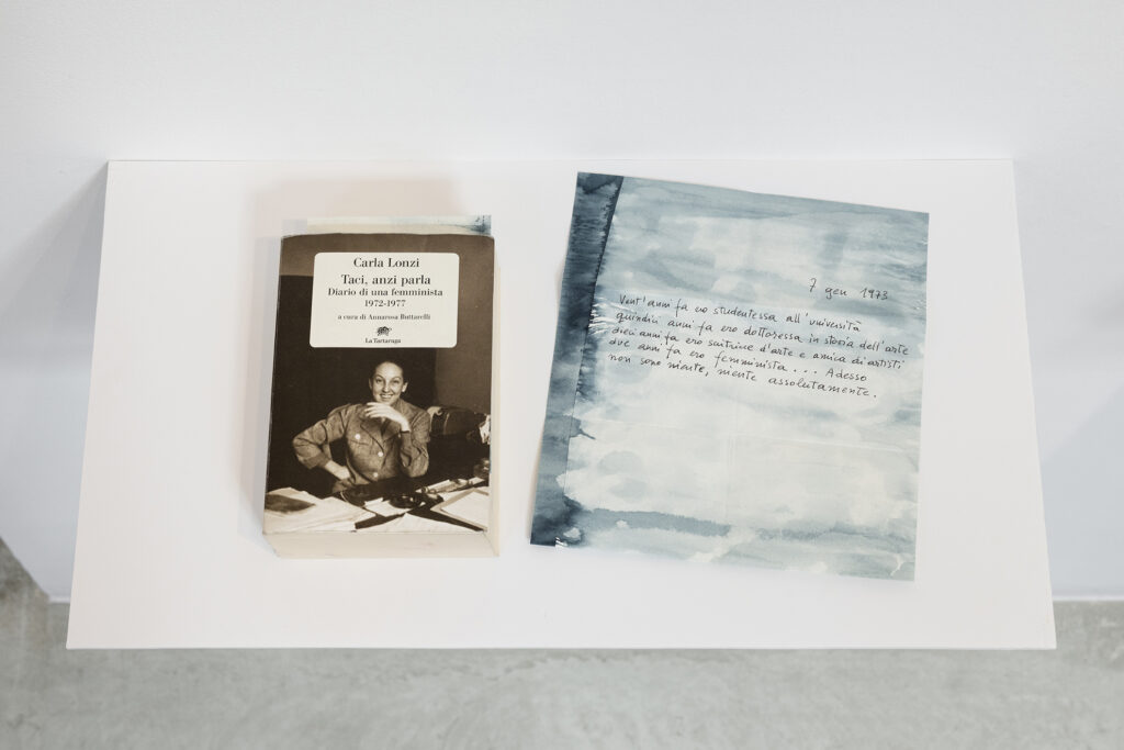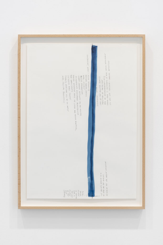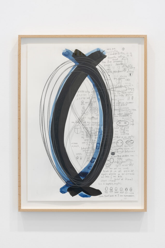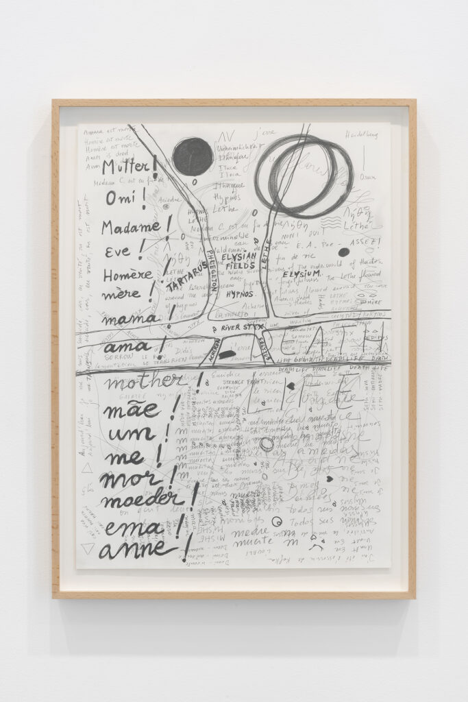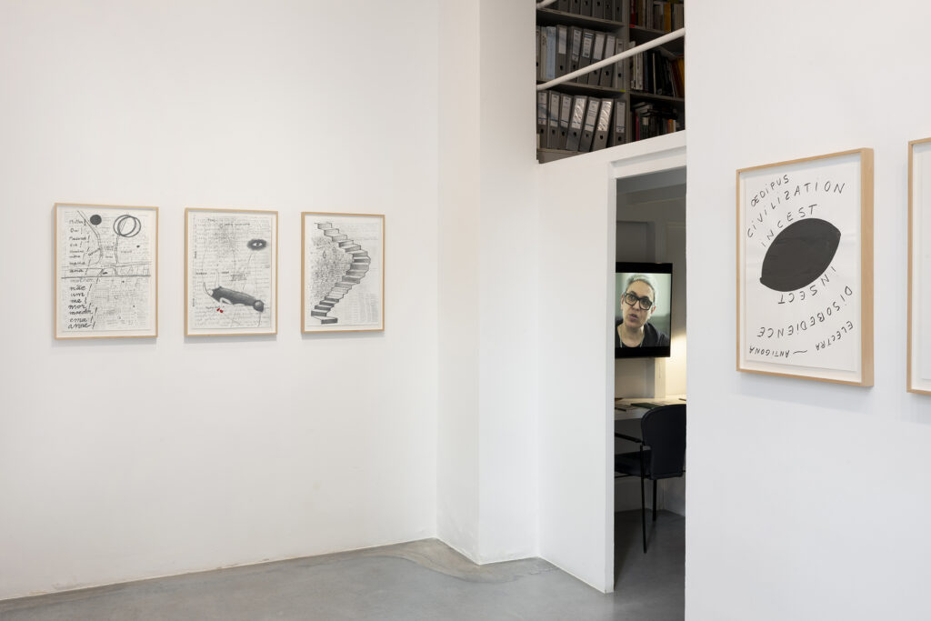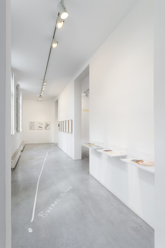 Walter Benjamin ha muerto, la actual exposición de Dora García en la Galería Elba Benítez, podría considerarse en su conjunto como una manifestación de este particular y peculiar tiempo verbal. La exposición toma como punto de partida la «lectura» que García hace de las vidas y las palabras de un pequeño grupo de figuras intelectuales y culturales radicales del siglo XX: Asja Lācis, directora de teatro y pedagoga letona; Carla Lonzi, crítica de arte y feminista italiana; Alejandra Pizarnik, poeta argentina; y (de forma algo más indirecta, pero aún así central) el teórico y crítico alemán Walter Benjamin. A partir de estas figuras del pasado, y en consonancia con su propia práctica artística distintiva, García ha creado una serie de obras interrelacionadas en diversos formatos basados en texto y dibujo, incluyendo dibujos en paredes y suelos, dibujos sobre papel y objetos de técnica mixta. Pero, aunque se basa en la historia intelectual, la práctica de García no deviene en una biografía intelectual; en cambio, al crear las obras de arte que se exponen en Walter Benjamin ha muerto, la propia «lectura» (y escritura) de García de las lecturas y los escritos de estas figuras históricas se ha convertido en parte de la historia, una historia que se extiende (y no puede dejar de extenderse) para incluir a la propia García y al presente en el que ella (junto con nosotros) habita. Como siempre, un retrato revela tanto sobre el retratista como sobre el retratado