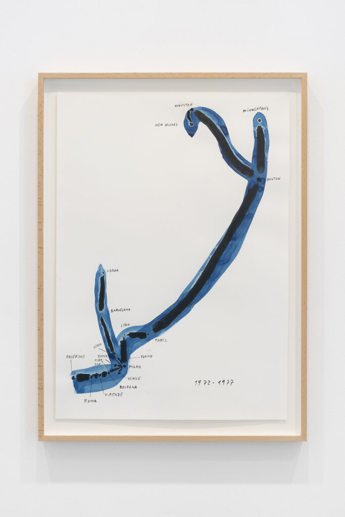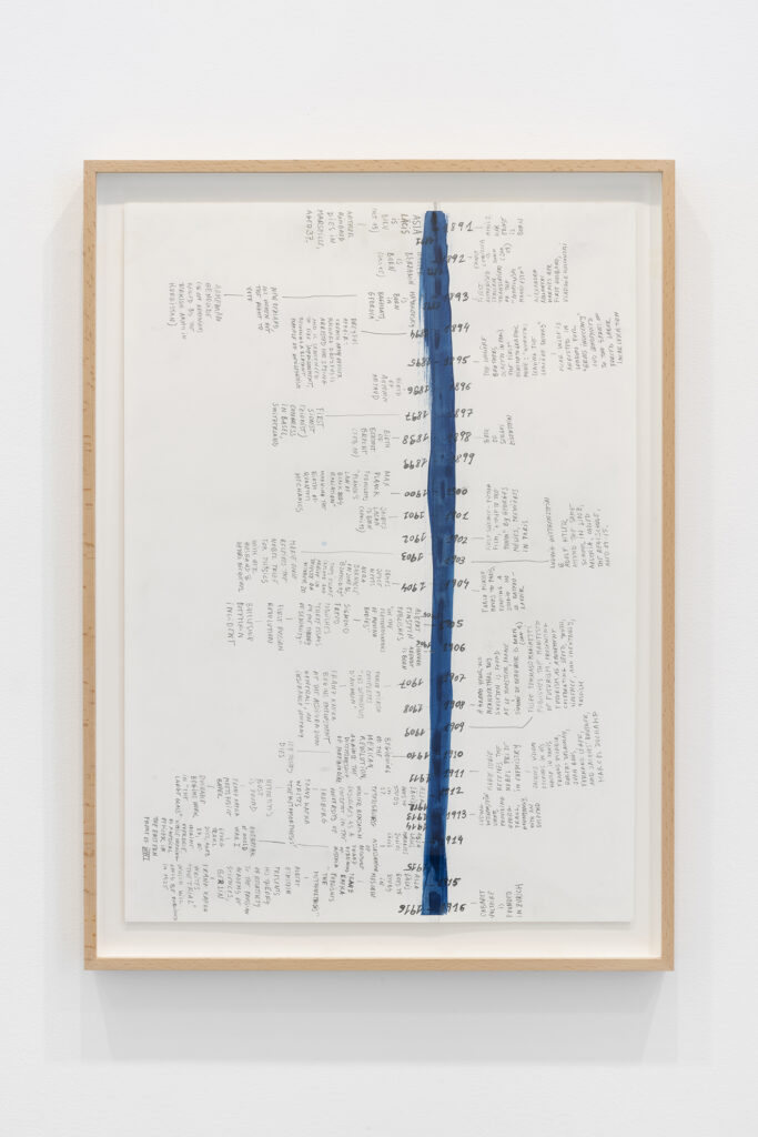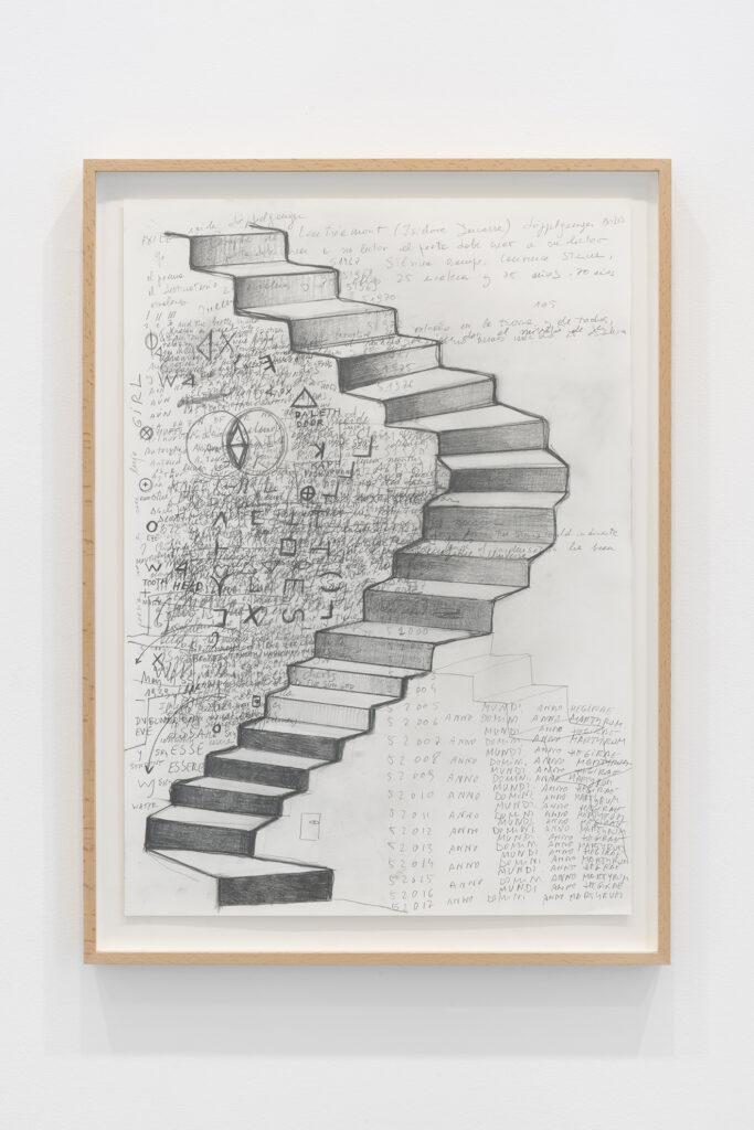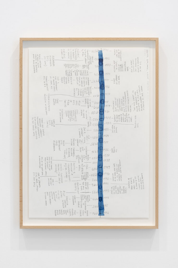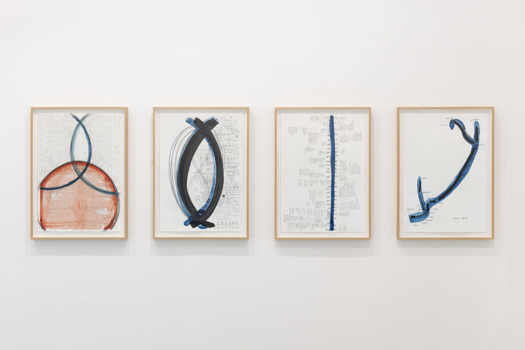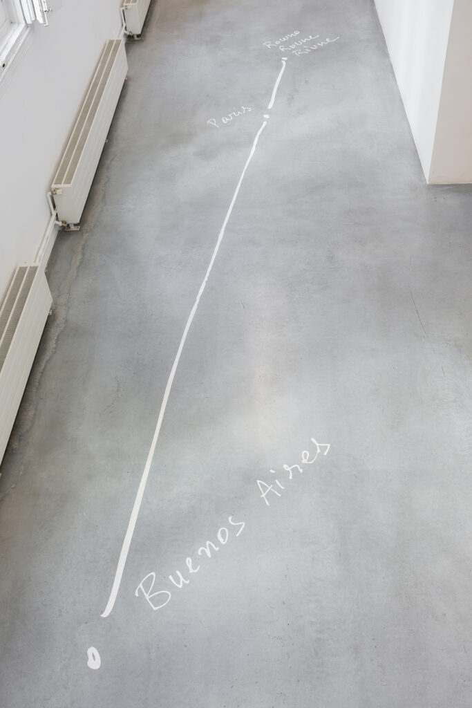 Este afán de perseguir, poseer y renovar la presencia del pasado en el presente implica y, al mismo tiempo, permite una gran libertad temporal en toda la obra de García, una libertad que se expresa explícitamente en Hopscotchs, una serie de dibujos que presentan los datos biográficos básicos de los protagonistas de la exposición (Lācis, Lonzi y Pizarnik) en forma de diagramas de suelo inspirados en el juego infantil de la rayuela, es decir, en los que la secuencia no viene determinada por la cronología, sino por el azar y la elección. En estas obras, la referencia a la novela estructuralmente experimental de Julio Cortázar, Rayuela, es explícita; más implícito es el desafío a la noción de la historia como impulsada por el progreso recto e ineludible del materialismo dialéctico, una noción inseparable de gran parte del pensamiento político del siglo XX que influyó en estos mismos pensadores.